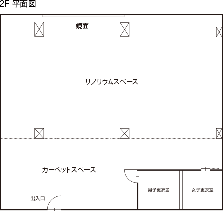 冷暖房、男女更衣室、壁面ミラー(スタジオ北側壁面)、駐車場(普通車専用)